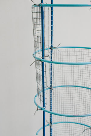 A colorful, minimalistic structure of bent rods and patchworked wire mesh evokes the resourceful, scrappy architecture of chicken coops in Latin American campos. Bright paint nods to Puerto Rican coastal homes, while the precise bends and tie-wire construction evoke industrial materials like PVC, blending craftsmanship with everyday resilience.